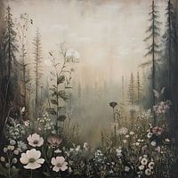 Misty Mornings Bloom - Dit landschap schilderij toont een serene voorstelling van diverse bloemen in de voorgrond met een mystiek, dichtbebost dennenbos en zachte mist op de achtergrond, badend in zachte, gedempte kleuren bij vermoedelijk ochtendlicht.
