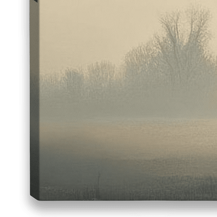 Misty Veil - Dit landschapsschilderij toont een serene polder met een zachte mist die het zicht subtiel vervaagt, waardoor een bijna magische atmosfeer ontstaat, waarbij de contouren van bomen zachtjes in de verte oplossen.