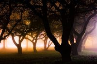 Oude appel bomen in de mist. Links op de achtergrond is het oranje licht van een verlichte weg te zien en rechts het witte licht van een fietspad, hierdoor ontstaat een beetje mysterieuse plaat...