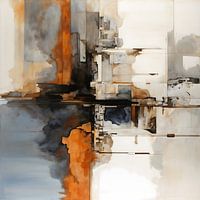 De afbeelding "mixed emotions" toont een abstract kunstwerk waarin contrasterende kleuren en structuren samensmelten. De compositie straalt een gevoel van spanning en harmonie uit, met warme aardetinten zoals oranje en bruin die een gevoel van warmte en passie oproepen, terwijl koelere tinten zoals blauw en grijs rust en introspectie suggereren. De ruwe, gelaagde texturen en onscherpe overgangen lijken emotionele complexiteit te symboliseren.