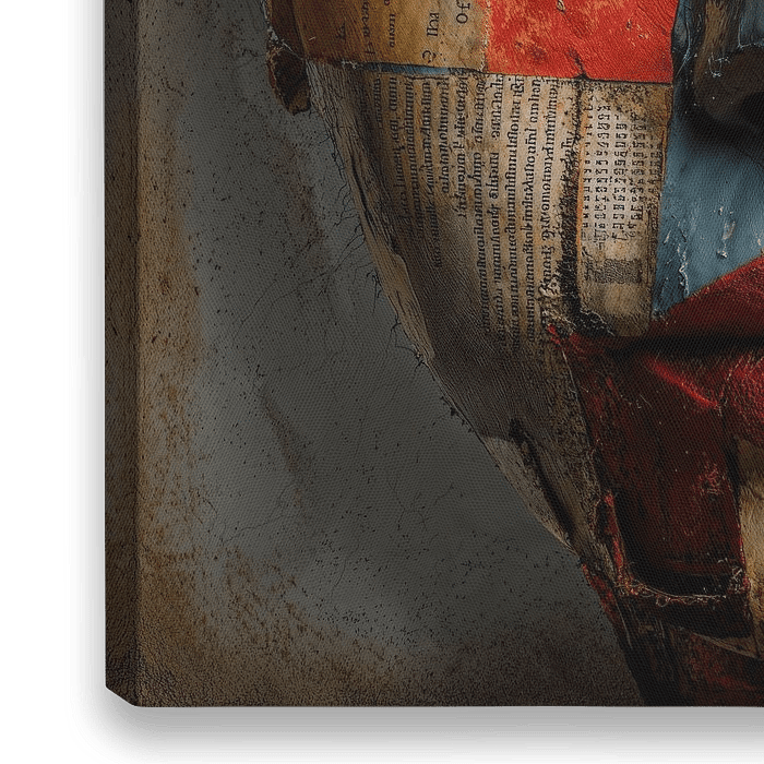Een kunstwerk van een vrouwengezicht uitgevoerd in een mixed-media collage stijl. Het gezicht is realistisch weergegeven en is gefragmenteerd en bedekt met verschillende texturen en kleuren, wat een surrealistisch en abstract effect creëert. De ogen zijn opvallend weergegeven, die de kijker recht aankijken met een intense, licht…