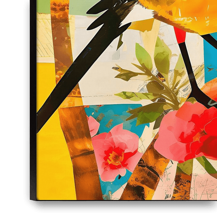 Kleurrijke mixed media kunstwerk van een vogel met een collage van uitgeknipte papieren, felle kleuren en een dynamische compositie met een krantentextuur, tegen een achtergrond van tropisch gebladerte en bloemen. Deze artistieke weergave legt de liefde voor alle levende wezens en ontzag voor hun schoonheid vast.