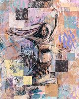 Kleurig mixed media kunstwerk van een vrouw met rok. In roze blauw oranje en zwart. Semi abstract werk gemaakt in photoshop.