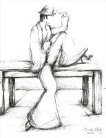 Portret , zwart -wit potloodtekening van een fashion model. Zij is gekleed in een wijde broek met een jasje en heeft een hoedje op haar donkere haar. Het is een elegante jonge vrouw , zij zit op een tafel haar arm leunt op haar knie en kijkt in de verte. Het licht schijnt op haar broek en gezicht ,het tekenpotlood is hier en daar wat uitgeveegd waardoor er schaduwen ontstaan wat diepte geeft .