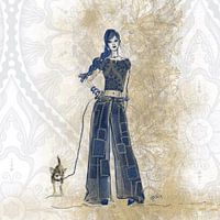 Mode schets jeansbroek met een jonge vrouw in haar patchwork jeans en haar hondje.
