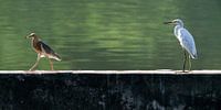 Een Javaanse Ralreiger en een Zilverreiger op de betonnen rand van een water bassin in een park in Noord Jakarta, Indonesie.