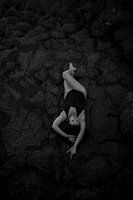 Deze foto is geschoten in een Marokkaanse badplaats, een afgelegen plek tussen de rotsen. Waar het model op de stenen lag, aan de zee, met mooi zacht licht op haar huid omdat de zon langzaam opkwam.