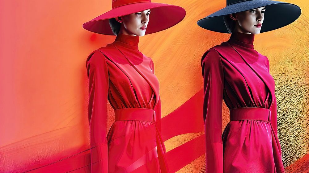 Dit schilderij toont drie modellen die poseren in elegante rode jurken en bijpassende hoeden. De kleurrijke achtergrond, bestaande uit dynamische abstracte penseelstreken, voegt energie en beweging toe aan de scène. De rode jurken van de modellen steken fel af tegen de speelse kleuren op de achtergrond, waardoor een sterk visueel contrast ontstaat. Deze compositie verenigt mode en kunst op een creatieve manier en benadrukt de individualiteit en elegantie van de modellen. De combinatie van klassieke rode outfits en de moderne, abstracte achtergrond creëert een harmonieus samenspel van stijl en expressie.