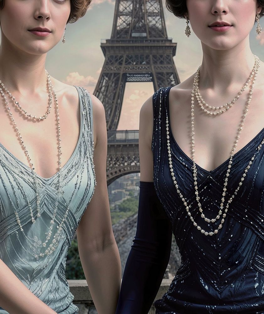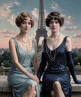 Dit werk vangt de essentie van tijdloze elegantie en romantiek, geïnspireerd door de glamour van de jaren ’20 in het hart van Parijs. Twee jonge vrouwen, gekleed in verfijnde art-decostijl, zitten voor de iconische Eiffeltoren en stralen zowel zelfvertrouwen als nostalgie uit. Hun zijden jurken, versierd met delicate kralen en borduursels, en hun sierlijke accessoires benadrukken de gratie van de tijd. De zachte, dromerige kleuren van de lucht op de achtergrond contrasteren met de gedetailleerde compositie van de dames op de voorgrond, wat een perfecte balans tussen romantiek en melancholie creëert.