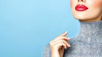 Close-up van een fotomodel met een grijze coltrui en opvallende rode lippenstift tegen een levendige blauwe achtergrond. De combinatie van kleur en contrast onderstreept een stijlvolle en elegante look.