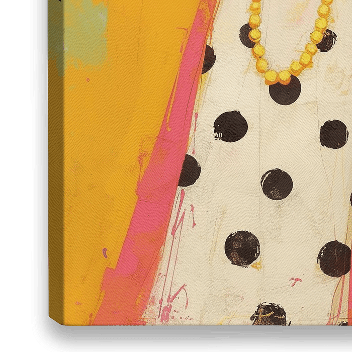 Modeportret - Dit vrouwen schilderij toont een stijlvolle dame met grote zonnebril en een opvallende gele jas, versierd met een witte jurk met zwarte stippen en opvallende oranje oorbellen.