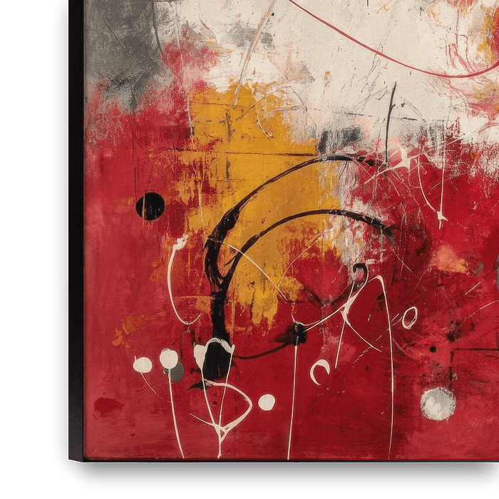 Dit is een abstract schilderij vol beweging dat ik heb gemaakt, met rode en gele penseelstreken die door elkaar draaien en witte en zwarte lijnen die er speels overheen lopen. De lagen verf geven het een levendige diepte die meteen opvalt. Wat ik er zo mooi aan vind, is die spontane energie - het voelt alsof ik precies dat moment heb…