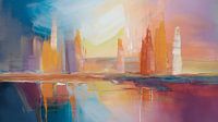 Een sfeervol kunstwerk in pasteltinten van een fantasie skyline met wolkenkrabbers die weerspiegelen in het water.