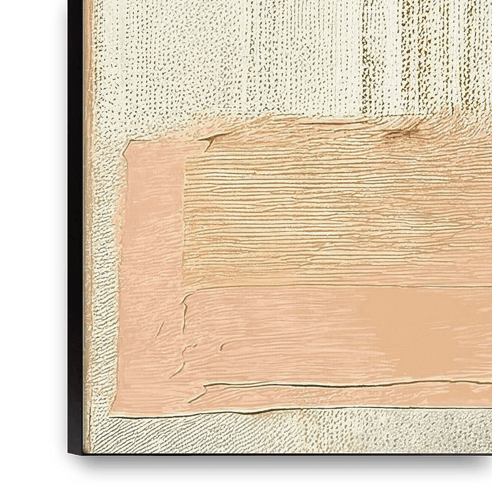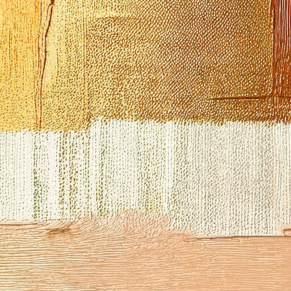 Een modern kunstwerk met een opvallend kleurenschema van goud, zalmroze, warm oranje/terracotta en natureltinten.