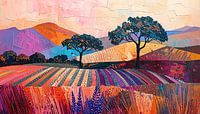 Een kleurrijk abstract Provençaals berglandschap met een veelkleurige linnenstructuur en bijzondere guilloche patronen.