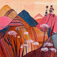 Een kleurrijk abstract berglandschap met een veelkleurige linnenstructuur en bijzondere guilloche patronen.