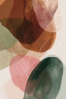 Een abstracte compositie waarin organische vormen in warme aardetinten en zachte pastels elkaar ontmoeten. De vloeiende lijnen en transparante overlappingen creëren een rustgevende dynamiek, waarbij diepe groentinten, terracotta en roze subtiel in elkaar overvloeien. Het minimalistische lijnenspel in wit voegt een delicate, moderne touch toe aan dit sfeervolle artwork.