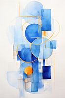 Modern Abstract - Je ziet een schilderij met een moderne abstracte uitstraling, waarbij geometrische vormen en organische cirkels elkaar overlappen en samenkomen in verschillende tinten blauw. Accenten van geel / goud voegen een verfijnde toets toe, die het werk zowel diepte als elegantie geven. De subtiele overgangen en de sterke…
