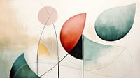 Abstracte vormen op lange, mysterieuze zwarte stelen, die als silhouetten oprijzen tegen een achtergrond van zacht wit en subtiele aardetinten. De compositie straalt een gevoel van elegantie en subtiliteit uit, waarbij de kunstenaar speelt met de contrasten tussen de diepe duisternis van de stelen en de lichte, luchtige achtergrond. De achtergrond van wit en beige vormt een rustgevend contrast, waardoor de levendige vormen in oranje rood en groen/grijze tinten nog meer tot leven komen.