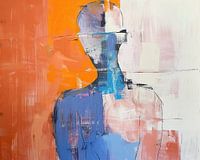 Modern Abstract - Op dit abstract portret schilderij zie je een figuur in koele kleuren, voornamelijk blauw en wit, met een opvallende oranje achtergrond die de contouren van het gezicht benadrukt.