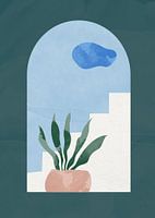 De abstracte boogvorm in een moderne abstractie laat een doorkijk toe in de zomertuin.