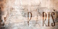 Dekorative Collage aus typischen Paris Motiven. Die bekannte Brücke Pont Neuf und dessen Umgebung bilden dabei die Grundlage. Weitere Bestandteile sind der Eiffelturm und typografische Elemente. Modernes Kunstwerk!