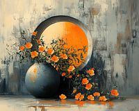 Modern Bloemen Schilderij - Modern stilleven met levendige oranje bloemen en abstracte achtergrond