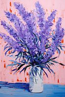 Modern Bloemstilleven - Voor je zie je een levendige weergave van een boeket paarse bloemen, expressief neergezet in een witte vaas tegen een contrasterende koraalroze achtergrond. De penseelstreken zijn los en dynamisch, wat resulteert in een modern en enigszins abstract bloemstilleven. Het palet bestaat uit verschillende tinten paars…