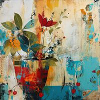 Modern Bloemstuk - Dit abstracte schilderij speelt met texturen en laagjes, waarbij een bloemstuk in een vaas centraal staat. De combinatie van warme oranje en koele blauwtinten creëert een dynamisch contrast, terwijl de rode bloem en oranje bessen een speels visueel ankerpunt vormen.