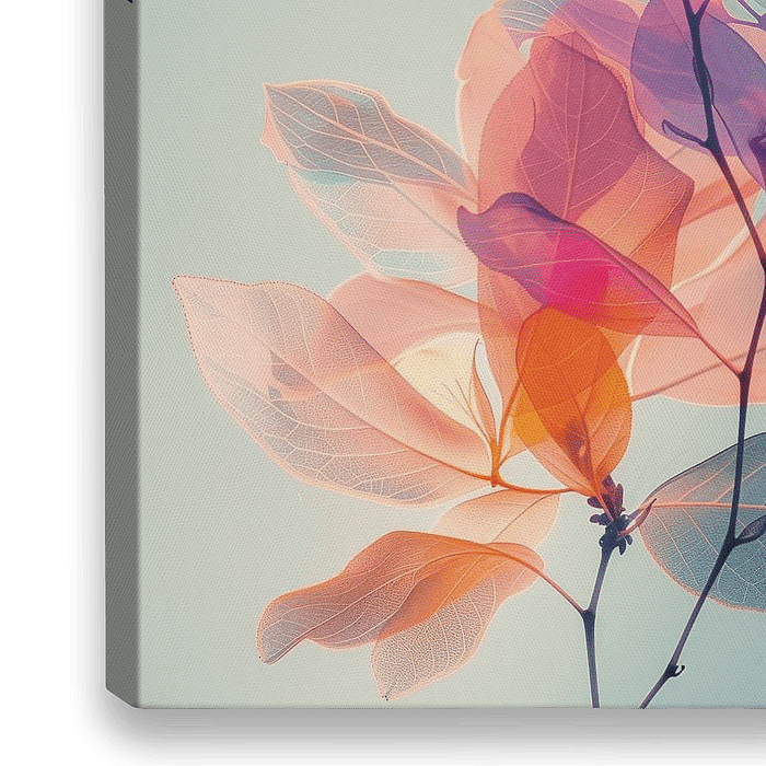 Dit botanische kunstwerk met een moderne twist toont een plant die lijkt te gloeien van binnenuit. Zachte lagen van transparante bloemblaadjes overlappen elkaar in een spel van licht, schaduw en subtiele kleurverschuivingen. Koele blauwtinten worden doorbroken door warme roze en rode accenten, waardoor het beeld een bijna etherische…