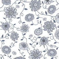 Een moderne twist aan een klassiek Engels patroon. Bloemen en blauwe bladeren wisselen elkaar af op een witte achtergrond.