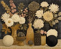 Modern Floral Arrangement Delight - Dit stilleven schilderij toont een combinatie van prachtige bloemen in verschillende vazen, met een opvallend palet van goud-, beige- en witte tinten, wat het geheel een moderne uitstraling geeft.