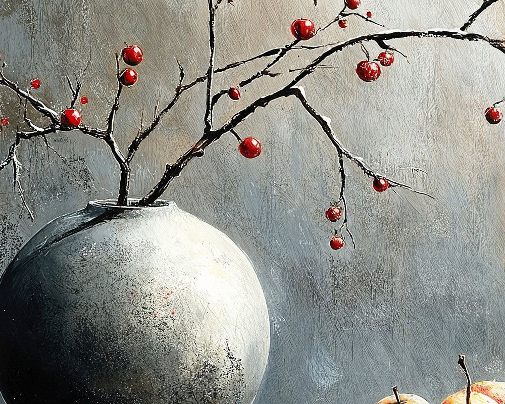 Details: stilleven, modern, takken, fruit, appel, bes, vaas, abstract