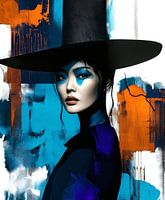 Portret van een vrouw met een grote zwarte hoed en donkere kleding tegen een abstracte kleurrijke achtergrond. Gedurfde accenten van blauw, oranje en wit creëren een dynamisch en stijlvol contrast.