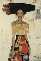 Dit werk toont een elegante, slanke vrouw met een opvallend zwart breedgerande hoed, gedetailleerd met bloemen. De jurk bestaat uit een mozaïek van rijke kleuren, variërend van rood tot goud en groen, met patronen die doen denken aan een Japanse kimono. Het beeld straalt verfijning en kracht uit, met een subtiele nadruk op zowel…