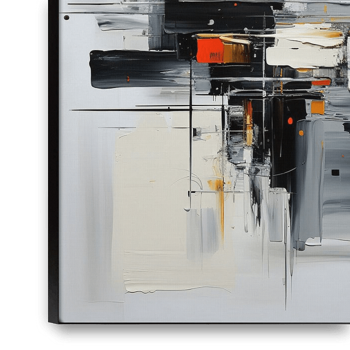 Dit moderne abstracte schilderij wordt gevormd door krachtige penseelstreken die gedefinieerde vlakken creëren, een samenspel van zwart, grijs en accenten van geel en rood. Het kunstwerk straalt een eigentijdse energie uit, waarin kleur en textuur samenkomen in een harmonieuze visuele dans.