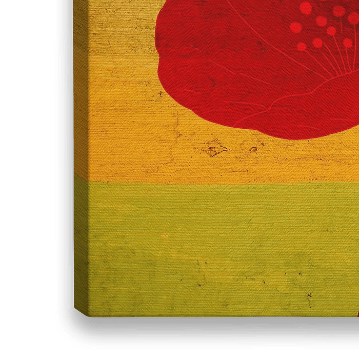 Dit is een modern Japandi, minimalistisch kunstwerk van twee klaprozen (papavers) in felle kleuren.