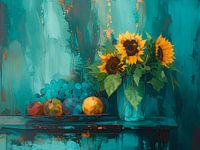Dit levendige Stilleven met zonnebloemen heeft een modern, opvallend palet van blauwgroene en gele tinten.