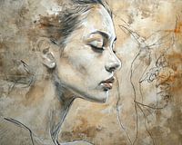 Modern Portret | Sereniteit - Het schilderij vangt de kijker met zijn rustige aardetinten en subtiele schetsachtige details. De serene uitdrukking van het vrouwelijk portret en de gedempte achtergrond met haar gelaagde texturen, creëren een ingetogen maar expressief stuk dat een verfijnde blik kan geven aan iedere…