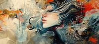 Modern Portret | Vrouw met Lijnen - Dit moderne stuk is een fascinerende fusie van portretkunst en abstracte vormen, vloeiend samengebracht met een breed scala aan kleuren en texturen. Het gezicht van de vrouw is expressief en zacht, omlijst door dynamische lijnen en gouden accenten, die zowel diepte als een vleugje luxe toevoegen. De koele blauwtinten contrasteren prachtig met de warme oranje en rode vegen, terwijl de visuele complexiteit van het schilderij de kijker blijft boeien.