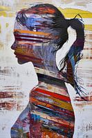 Modern Portret - Het schilderij toont een zijprofiel van een persoon, opgebouwd uit expressieve, abstracte penseelstreken en een levendig kleurenpalet vermengd met witte en neutrale achtergronden die voor balans zorgen. Tekstfragmenten voegen een laag van mysterie toe, terwijl de rode en blauwe tonen in het profiel onmiddellijk de aandacht trekken en de kijker uitnodigen om dieper in het werk te duiken.