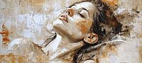 Modern Portret - Dit boeiende portret brengt een fascinerende vermenging van abstracte en realistische elementen samen, waarbij de rijke textuur en het subtiele spel tussen licht en schaduw het werk een levendige diepte geven. De aardse kleuren, van warme omber tot delicate crème tinten, worden geaccentueerd door gedurfde oranje accenten, en creëren een serene doch expressieve ambiance die elke kamer op zou kunnen warmen.