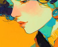 Modern Portret - Dit vrouwen schilderij presenteert een sterk gestileerd portret van een vrouw, met levendige, abstracte kleurelementen in oranje, geel, blauw en zwart, die samen een dynamische en moderne visuele ervaring creëren.