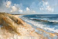 Een modern olieverfschilderij van een kustlandschap, met diepte en gelaagdheid in de kenmerkende stijl van het abstract expressionisme. Het palet omvat zachte pasteltinten en warme kleurschakeringen, wat resulteert in een prachtig, gedetailleerd werk met vloeiende penseelstreken.