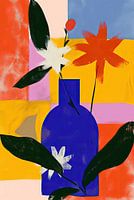 Centraal staat een blauwe vaas waaruit diverse gestileerde bloemen en bladeren ontspruiten. De bloemen lijken haast te zweven tegen een achtergrond van grote, gewaagde kleurvlakken in rood, geel, blauw en roze. De textuur en penseelstreken geven het werk een dynamisch en expressief karakter. De compositie balanceert tussen figuratieve en abstracte elementen, waarbij de bloemen en de vaas herkenbaar blijven, terwijl de achtergrond de vrijheid van interpretatie biedt.