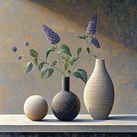 Modern Stilleven Bloemen | Echoes of Porcelain Solitude - Stilistisch schilderij van bloemen in vazen op een neutrale achtergrond