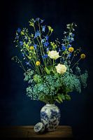 Modern stilleven van een boeket veld bloemen in de kleuren blauw en geel in een Delfts blauwe vaas met een warme donkerblauwe achtergrond. Bloemen in een vaas