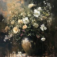 Details: bloemen, vaas, anemonen, rozen, impressionistisch, schilderij, wit, bruin, groen, zwart, Warm glow