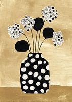 Modern Vase with Floral Vibes - Dit bloemen schilderij toont een elegante zwarte vaas met witte stippen, gevuld met speelse bloemen op een warme gouden achtergrond, waardoor het geheel een moderne en stijlvolle uitstraling heeft.
