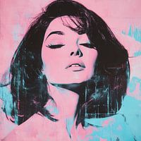 Een retro-geïnspireerde poster met een dynamische compositie, waarop een stijlvolle vrouw met golvend zwart haar te zien is. De afbeelding is uitgevoerd in levendige roze en licht-cyan tinten, wat een speelse en nostalgische sfeer oproept. De combinatie van gedurfde kleuren en een dynamische lay-out geeft de illustratie een moderne…